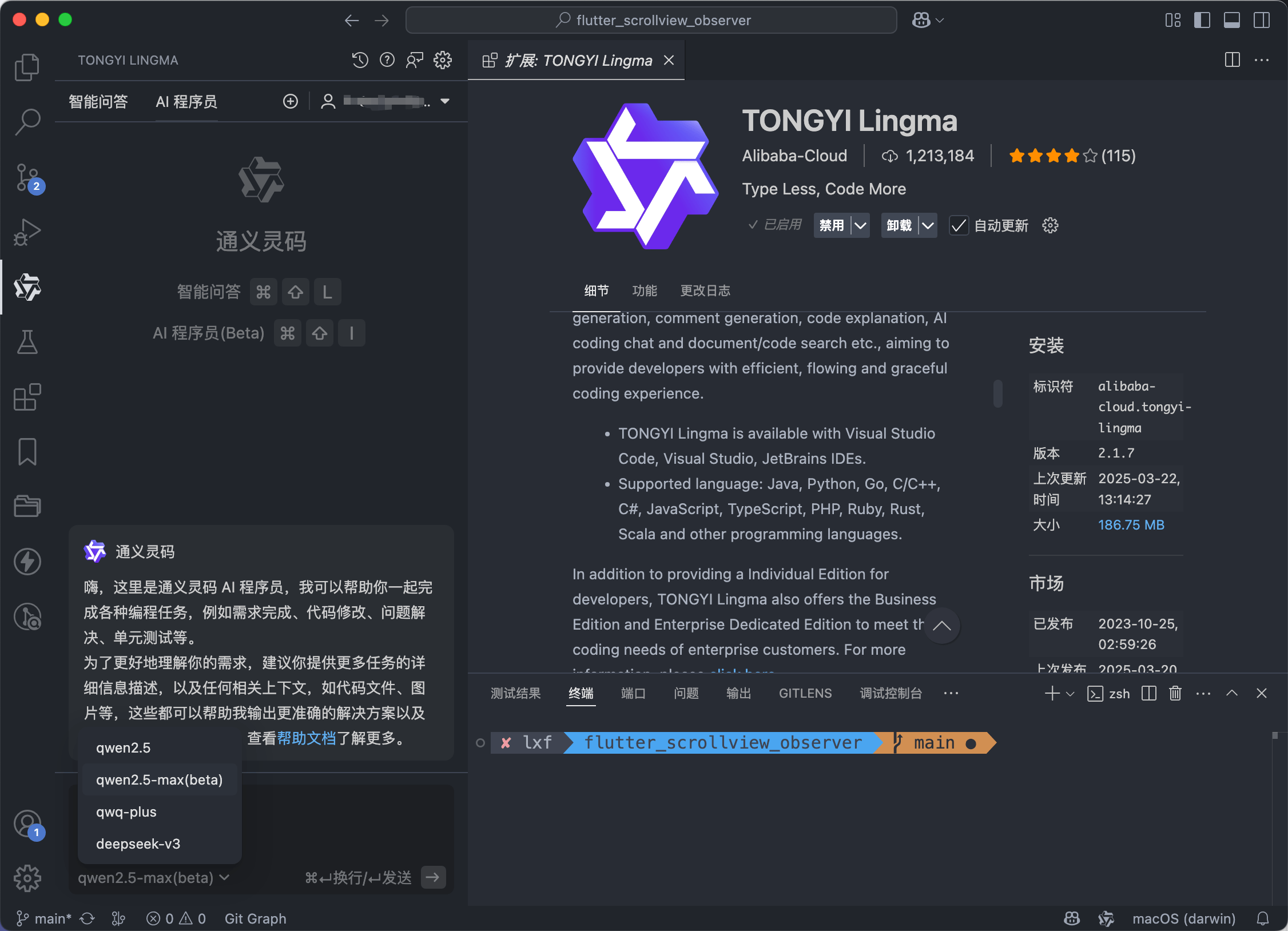 TONGYI Lingma 可以在 VSCode 插件中直接搜索安装,安装完成点开相应图标,会提示登录,按它说的做即可。