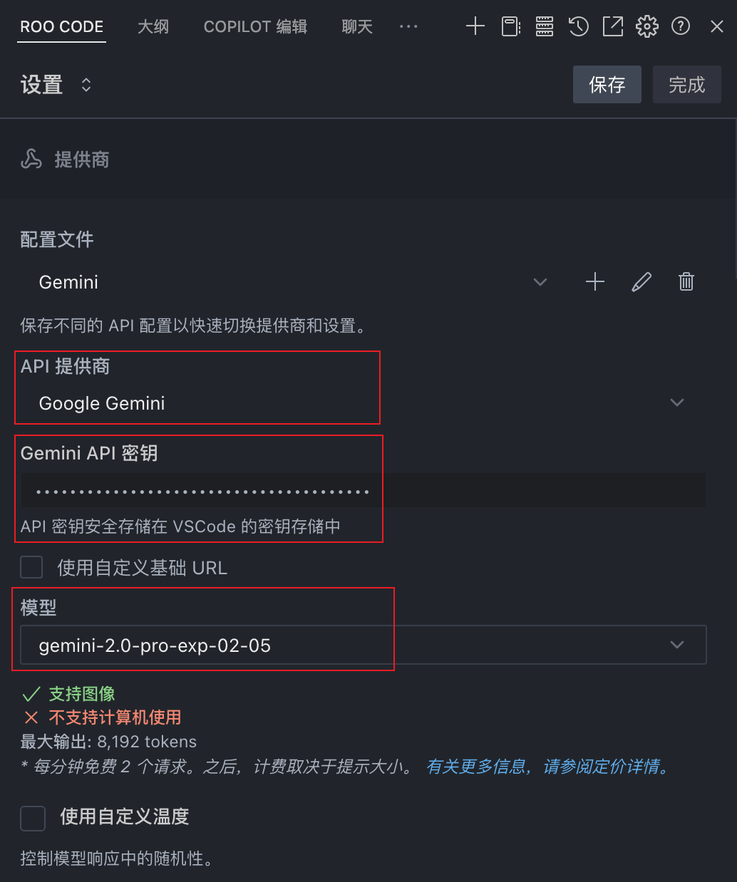 API 提供商:Google GeminiGemini API 密钥: 填写你刚刚创建的Key模型: 按需选择